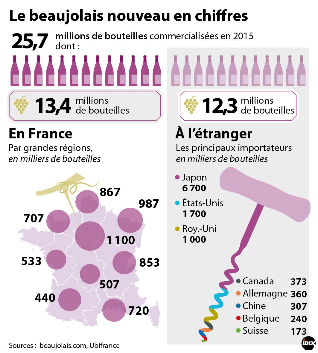 Chaque année, le 3e jeudi du mois de novembre, des milliers de personnes vont célébrer l'arrivée du vin Beaujolais nouveau en France et à l'étranger aussi. Le Beaujolais nouveau se fête depuis 1985. Cette date marque le début de la vente des premiers vins Beaujolais.