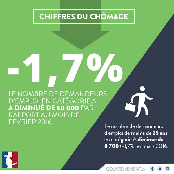 Lors du dernier Conseil des Ministres du 27 abril 2016, la ministre du travail, de l'emploi, de la formation professionnelle et du dialogue social a présenté une communication sur la situation de l'emploi en France. Voici les chiffres présentées: